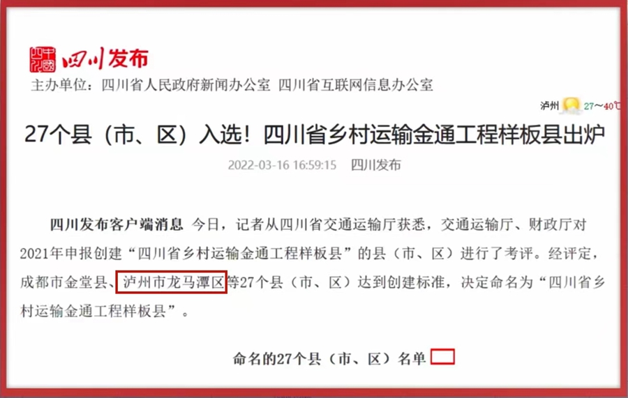 助力龍馬潭區(qū)以公交為紐帶實現(xiàn)了半小時經(jīng)濟(jì)圈,在江陽區(qū)實現(xiàn)全域公交村村通。江陽區(qū)54條農(nóng)村公交線路惠及群眾50萬人。在目前的公交線路中,全域公交、農(nóng)村公交線路占比達(dá)34%,江陽區(qū)“金通工程”全域公交先后2次在全省作經(jīng)驗交流,并獲得“四川省鄉(xiāng)村運輸金通工程樣板縣”殊榮。
