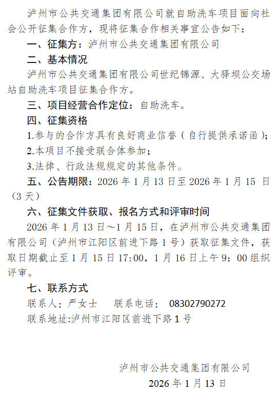 瀘州市公共交通集團(tuán)有限公司自助洗車項(xiàng)目征集合作方的公告